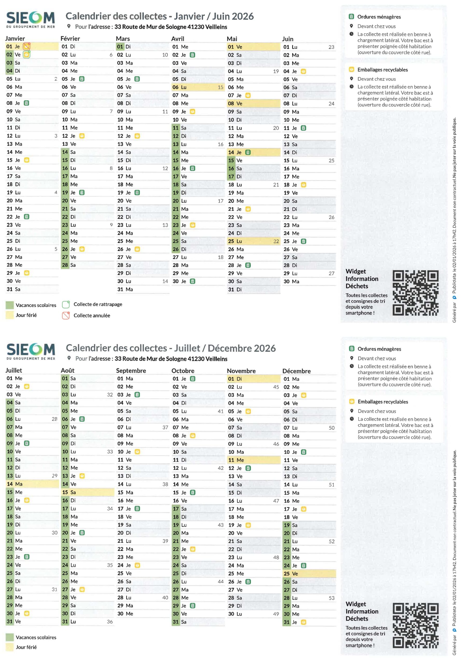 Calendrier Ramassage Ordures ménagères 2026